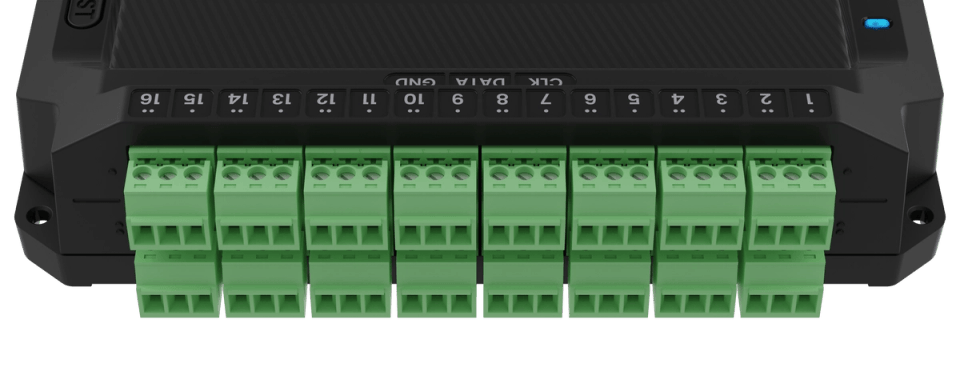 The PixLite E16-S Mk3 drives up to 6 universes of data on each of its 16 outputs for a total of 96 universes of LED pixel control. The easily accessible and removable screw terminal blocks each have three pins [Clock | Data | Ground], which is suitable for installations where pixel power is not routed through the pixel controller