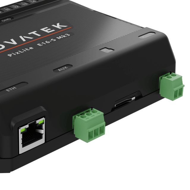 The PixLite E16-S Mk3 is an economical, but powerful pixel LED controller built upon Advatek’s 3rd generation PixLite Mk3 processor. The feature set of this processor are too significant to fit here, explore in the PixLite Mk3 Processor Datasheet